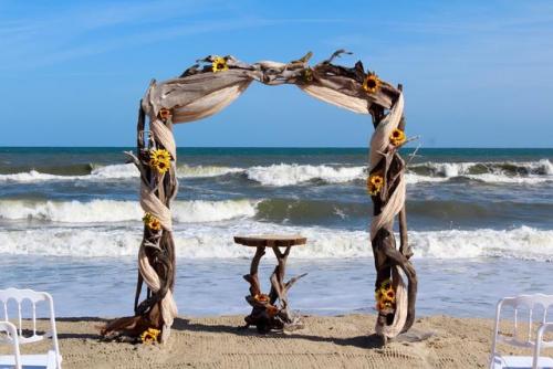 I Do OBX Chairs offers high quality, white resin, padded seat chairs for use at ceremonies, receptions and other special event needs. Our quality bamboo arches, driftwood arches, and accessories will add that unforgettable look to make your event complete. We serve the areas of Corolla to South Nags Head, Manteo and all points in between. We’re different! We are a full ceremony design company that will take care of all your ceremony needs. We’ll set-up your arch level to the horizon and place your chairs in perfect row sequence. And if your event is on the beach, we’ll even rake the sand and make sure the area is debris-free! You and your guests will receive our full attention to detail. Whether you are staging a small, intimate gathering or a larger, lavish event, we’ll provide you with professional service to help make your event run seamlessly. Our mission is to help make your event a wonderful experience to be remembered for a lifetime. We’ll even clean up your ceremony area AFTER your event! Let us do the work so you can enjoy your special day!!!